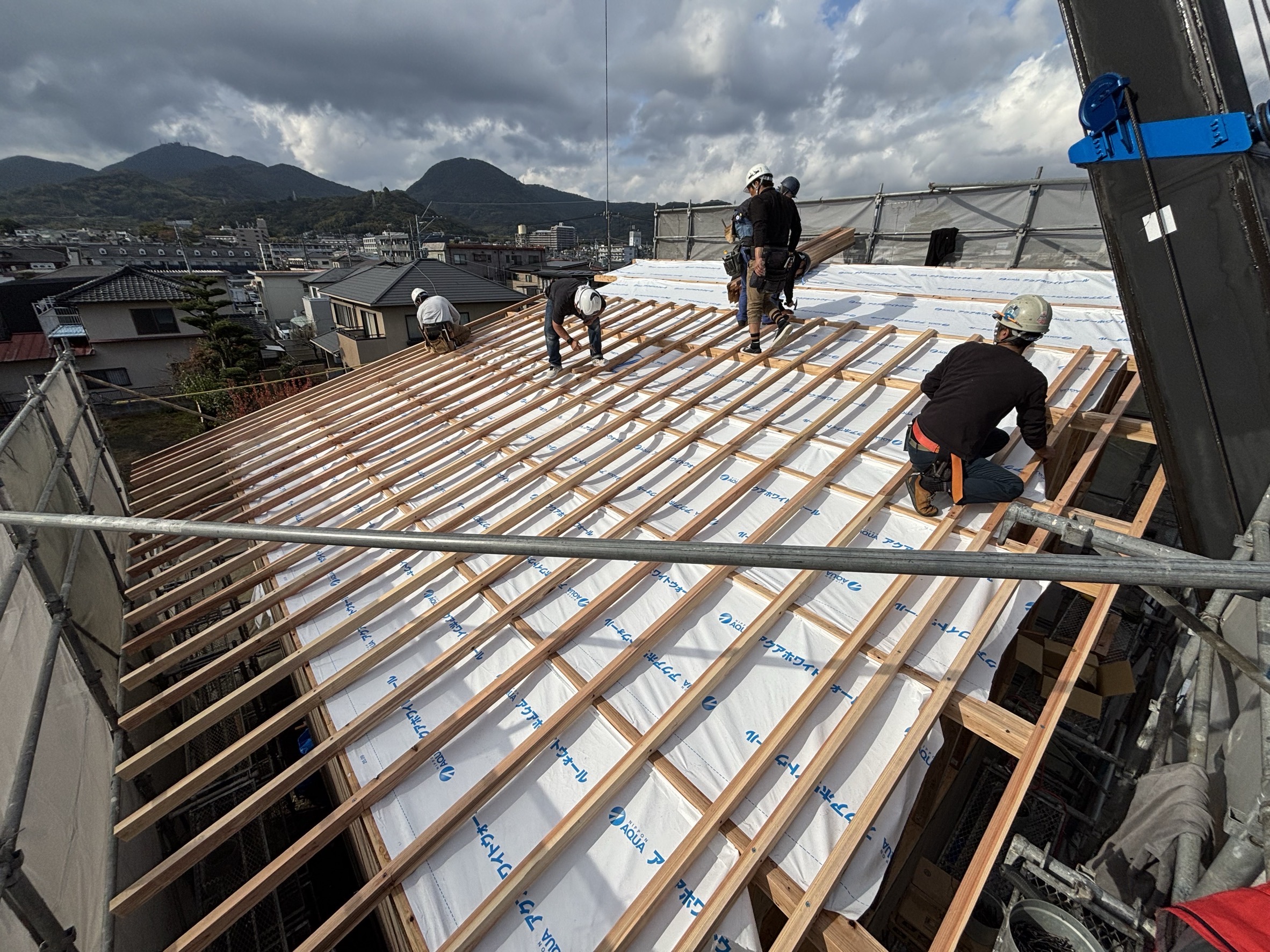 大工さんが役割を分担して張り出していきます。