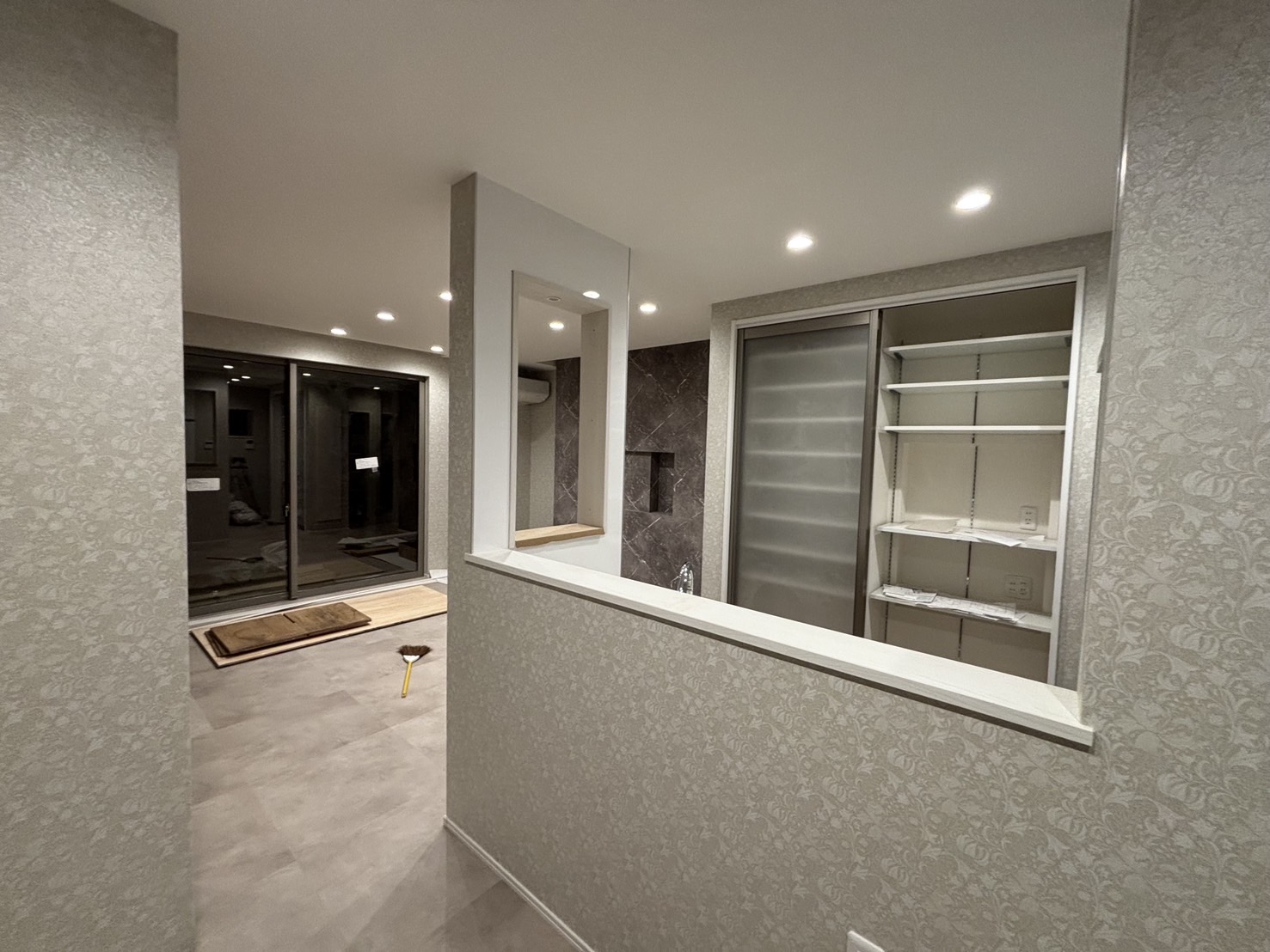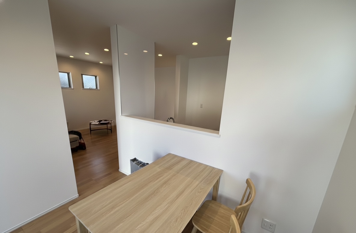 キッチン横の壁に開口を開けて飾り棚を設け