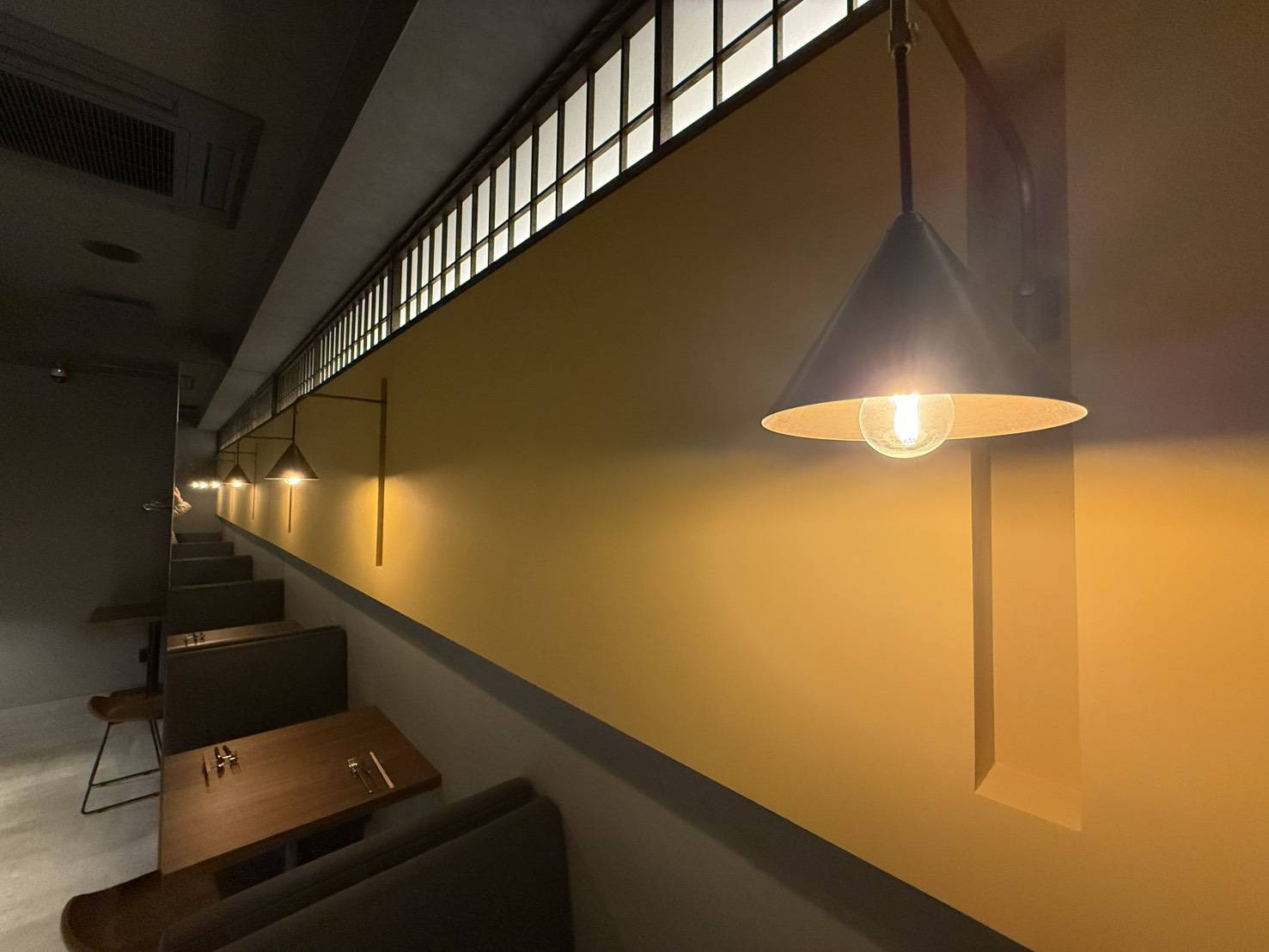 店内は全体的にグレーのモルタル調の仕上げを